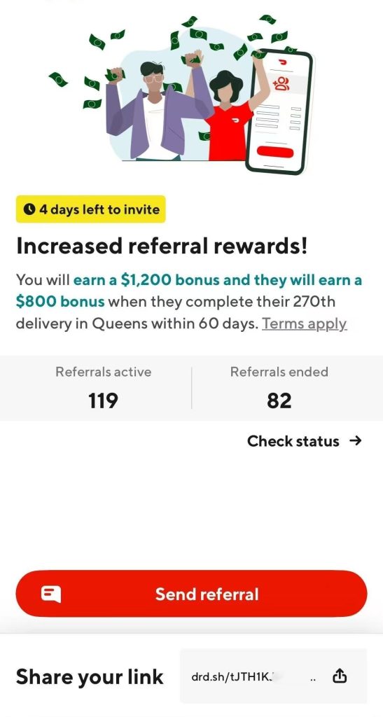 在美国,有不少华人依靠跑车、送餐来稳定收入。其中,DoorDash经常推出奖金丰厚的拉新活动,鼓励老司机推荐新司机入职。达标后: